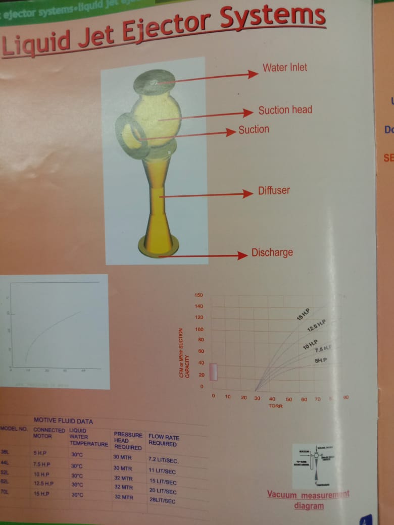 Liquid jet ejector system Liquid jet ejector system provides a low maintenance,low cost alternative to other vacuum systems.They are simple in construction consisting of suction housing,diffuser and motive nozzle. The operation of liquid jet pumps is based on high velocity liquid jet emerging from the motive nozzle entraining air or gas in the suction housing and compres- sing it to atmospheric pressure. Liquid jet pumps with flange connections are mainly used for production of vacuum in vacuum distillation,in technical institutes,in production plants and vacuum drying They are used for evacuating siphon lines,suction lines of circulating pumps and and condensers. It requires a complete package unit consisting of a liquid jet ejector,a tank, a circulating pump and a cooling tower unit(cooling tower with circulating pump)/cooler. The lowest suction pressure which can be obtained with a suction capacity of zero(blank vacuum)corresponds to vapour pressure of the motive liquid,which is dependent upon the temperature of the liquid. Because of it's study construction they are very attractive solution to the following: